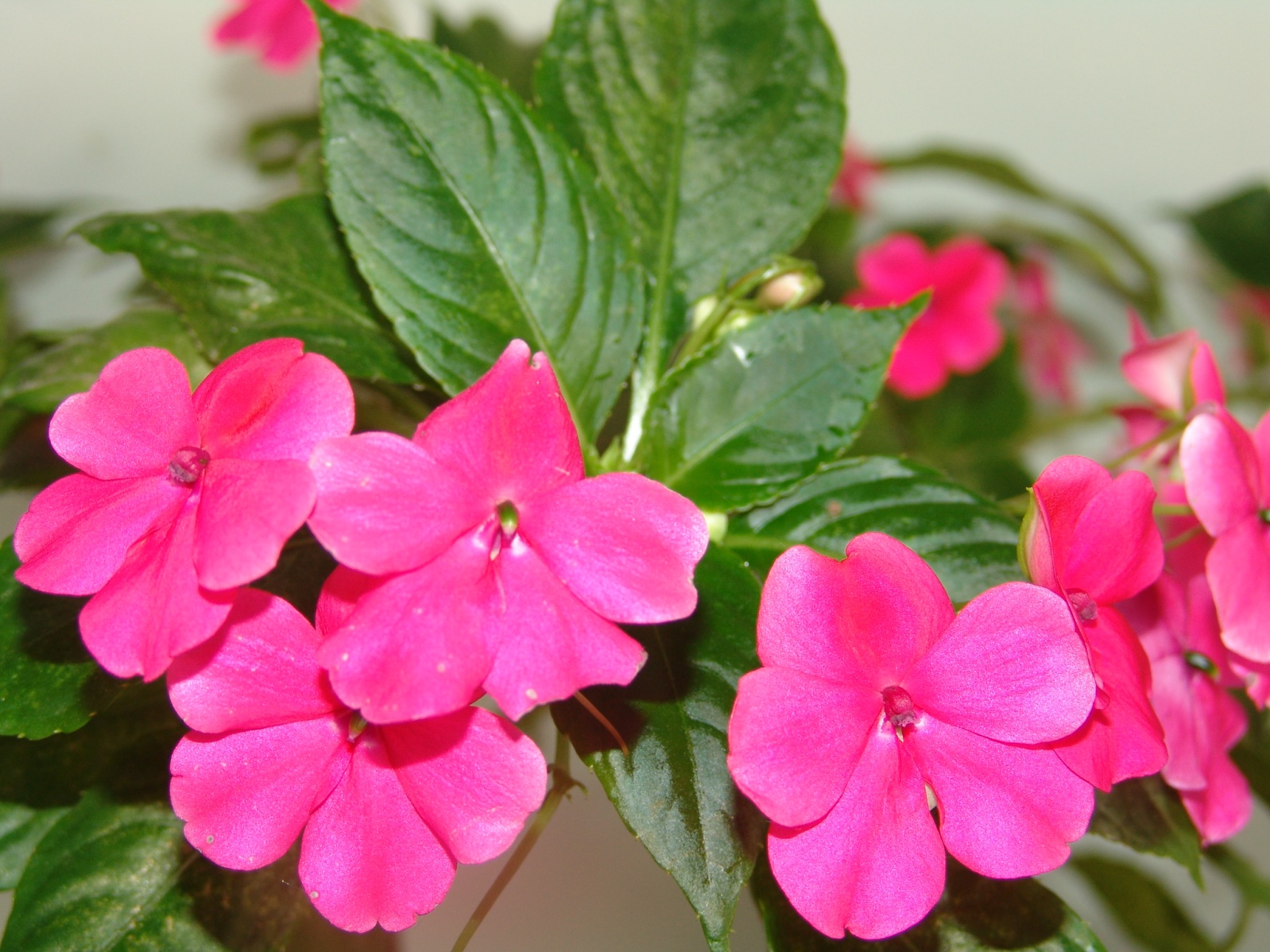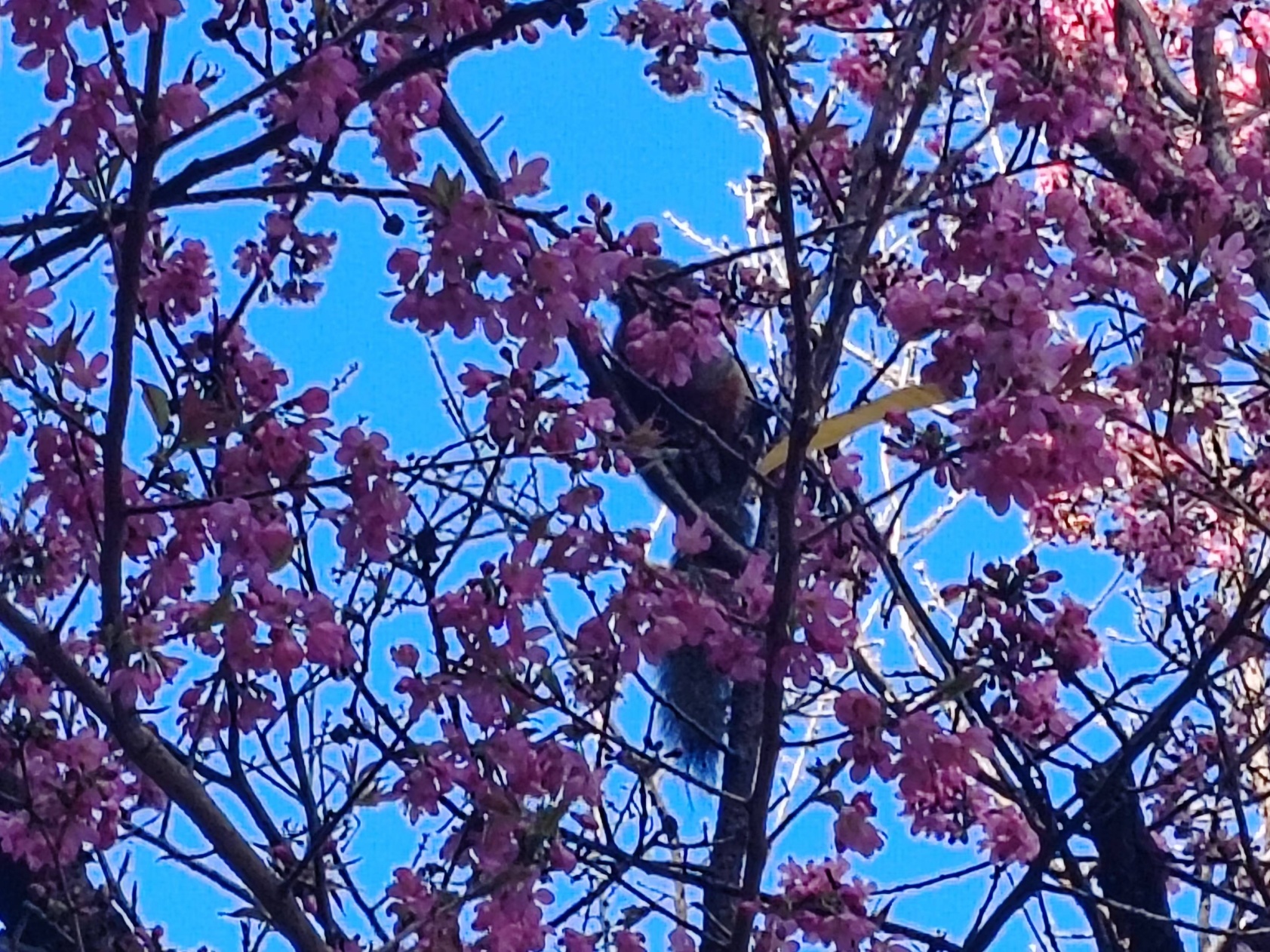 冬樱花的树梢上,满满地点缀着数不清的樱花,呈现出娇艳、淡雅的红色,充满了喜色喜气。树枝像儿童画中四射的太阳光一样,向四面八方散射。从树枝到枝头,樱花树的树枝上缀满了樱花。远远看去,整个枝梢就像一蓬粉红色的彩球。凑去近观,树上缀满了粉红色的冬樱花,那粉红的颜色,不浓不淡,还略带几分娇艳。