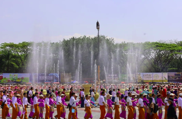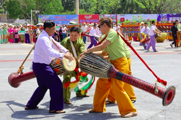 在开幕式现场上,非遗展演成为一大亮点。傣族《泼水节传说》以情景剧形式再现古老传说,讲述善良战胜邪恶、光明驱散黑暗的故事,诠释泼水祈福的文化内核;《花伞舞》中,少女们手持五彩花伞翩跹起舞,裙摆翻飞如彩云追月,展现傣家女子的柔美与灵动;男子群舞《象脚鼓舞》气势磅礴,鼓手们击打百年象脚鼓,踏节而歌,刚劲舞步彰显傣乡豪迈——该舞蹈于2008年被列入国家级非物质文化遗产名录。德昂族《水鼓舞》则以木鼓为魂、清水为媒,鼓点雄浑如雷,舞姿质朴有力,传递着人与自然和谐共生的理念,其2014年入选国家级非遗名录。此外,《铓秧舞》《团结花开》等节目轮番上演,铓锣声与欢笑声交织,描绘出节庆喜悦与民族团结的生动图景。
