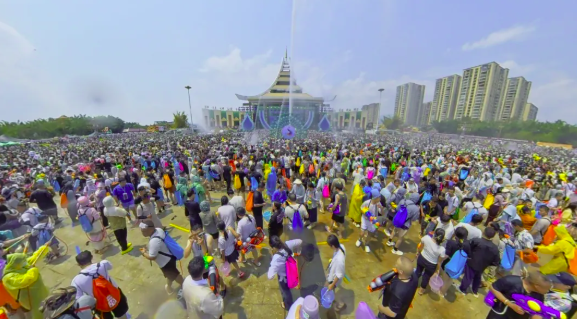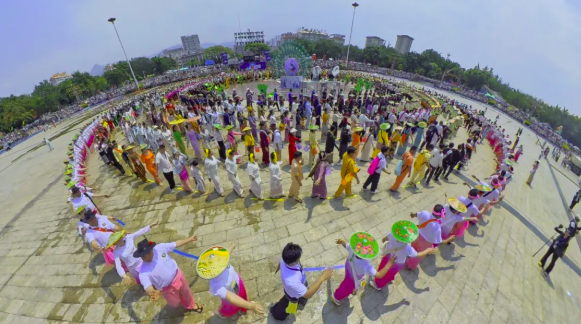 水是生命的源泉,是吉祥的象征。伴着欢快的象脚鼓声和铓锣声,身着盛装的各族群众在领队的带领下围着跳起了“嘎伴光”,人群如潮水般涌来,在芒市广场汇聚成象征着民族团结进步的同心圆,奏响铸牢中华民族共同体意识、携手奋进新时代的激昂乐章。鼓声震天,水花飞溅,吉祥的圣水映着阳光折射出七彩光芒,源源不断把祝福洒向人群。