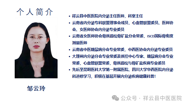 3.内分泌科简介祥云县中医医院内分泌科成立于2015年10月,是以中西医结合为特色的临床科室。科室现有医护人员 25人(医生 11 人,护士 14 人), 其中主任医师1人,副主任医师2人,主治医师 4人,医师 4人,其中中医专业医生 7 人, 西医医生 4人,中西医比例为 7:4,其中2人为研究生学历,9人为本科学历。副主任护师 1 人,主管护师2人,护师7人,护士4人。其中 13人本科,1人为专科学历。科室人员结构合理,技术力量雄厚。科室大部分医护人员有四川华西医院、广州中医药大学、昆明医科大学第一附属医院、云南省第二人民医院、云南省中医院等三甲医院进修学习经历。科室目前拥有胰岛素泵、动态血糖监测、眼底镜、院内外血糖管理系统及各种中西医先进诊疗设备。目前主要开展糖尿病( 糖尿病视网膜病变、胃轻瘫、糖尿病胃肠自主神经病变、糖尿病周围神经病变、糖尿病足、糖尿病酮症酸中毒、糖尿病合并各种感染)、代谢性疾病(高尿酸血症、痛风、血脂异常)、骨质疏松症、甲状腺疾病(甲状腺功能亢进症、甲状腺功能减退症、甲状腺炎、甲状腺结节)、甲状旁腺疾病、内分泌性高血压、风湿免疫疾病(类风湿性关节炎)等多种疾病的诊治工作。科室通过先进的现代医学诊疗技术,结合传统中药汤剂口服及中医针刺、艾灸、穴位贴敷、中药薰洗、穴位注射、刮痧等中医治疗技术,对上述疾病疗效显著。科室在各型糖尿病及并发症的诊疗上具有独特的治疗经验,赢得了广大患者的信任和良好的口碑。科室始终秉承“病人至上、仁爱为本”的院训,不断提高科室自身能力,更好的为患者提供优质的诊疗服务!