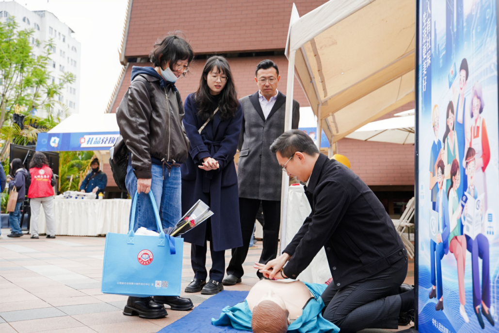 在工伤预防体验区,工作人员向群众演示海姆立克急救法