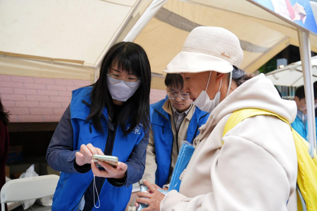 政策咨询区,工作人员教群众在手机上怎么办理社保业务