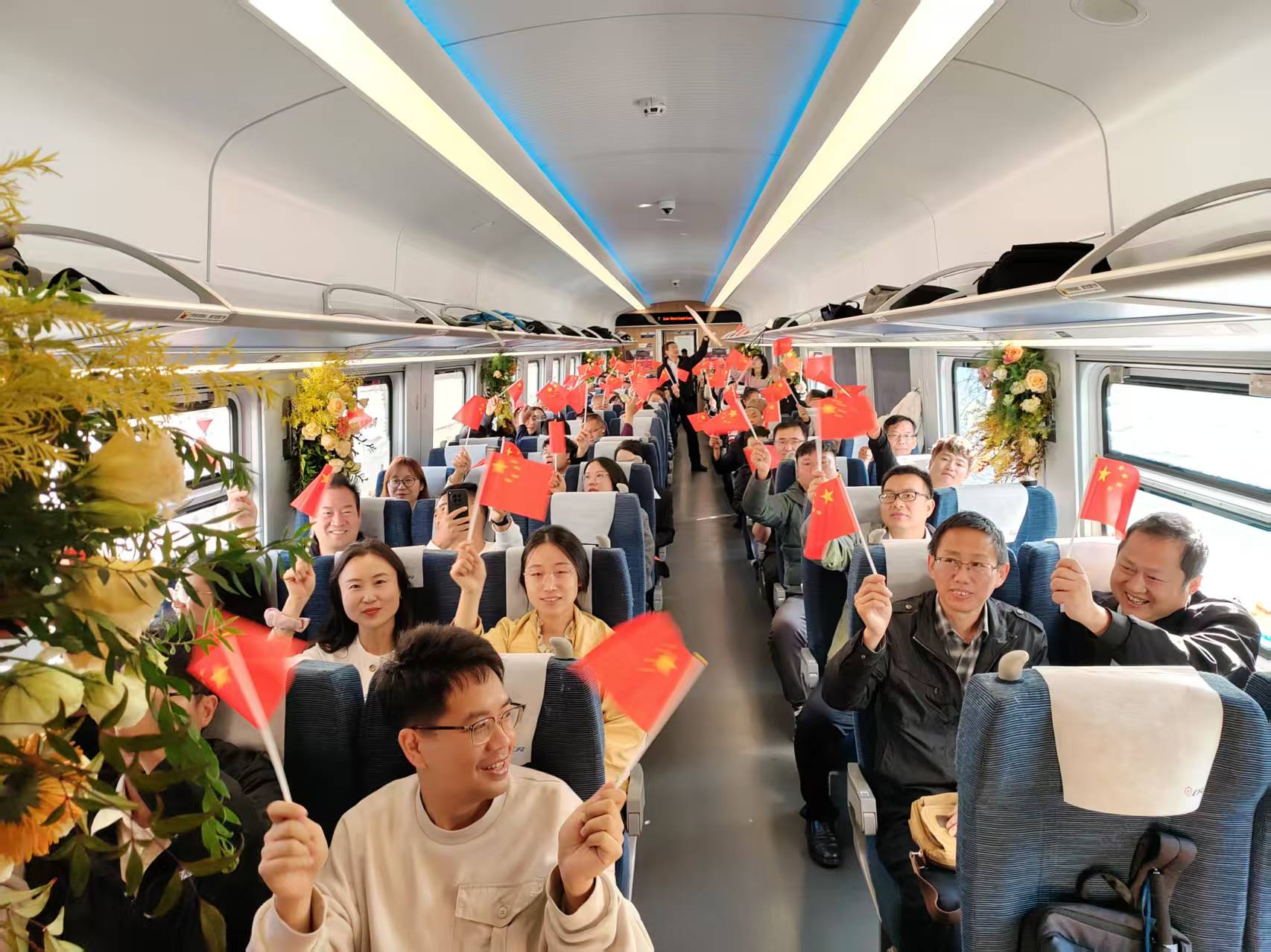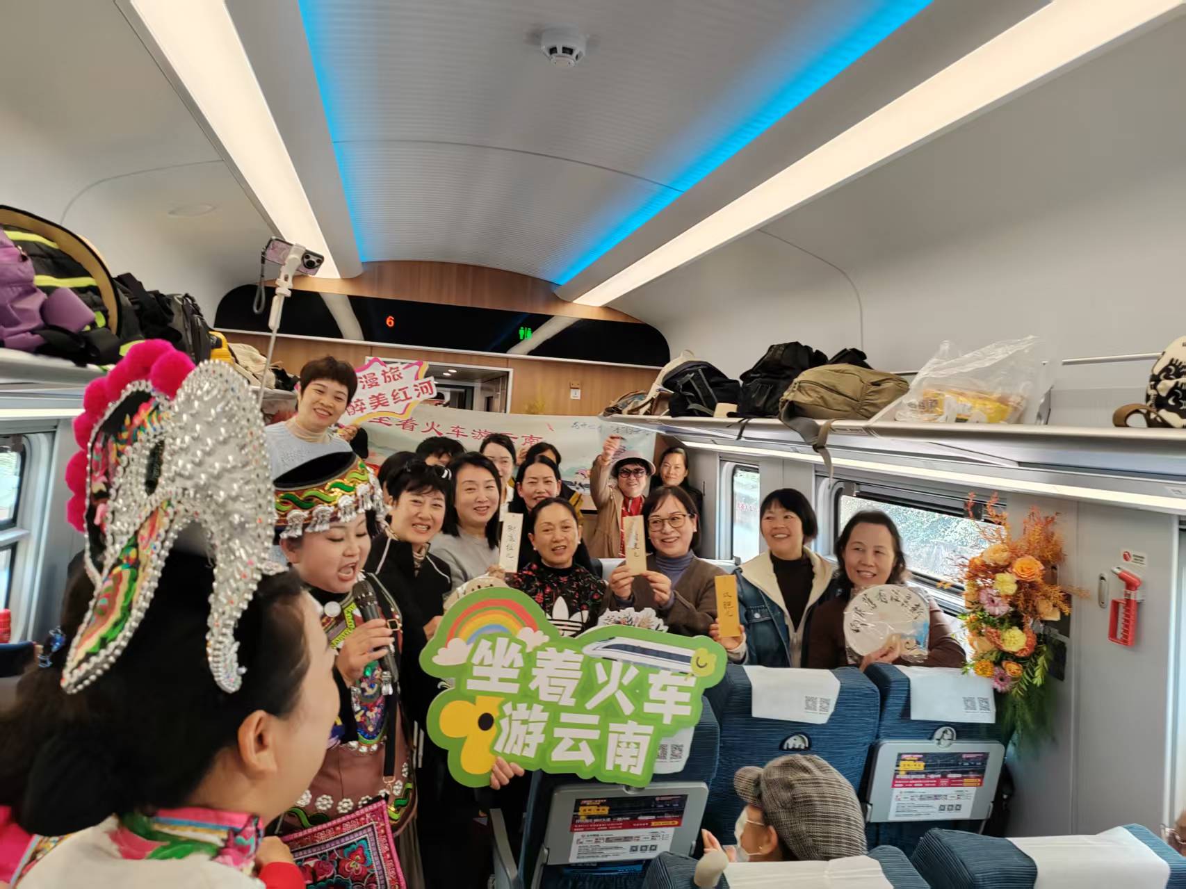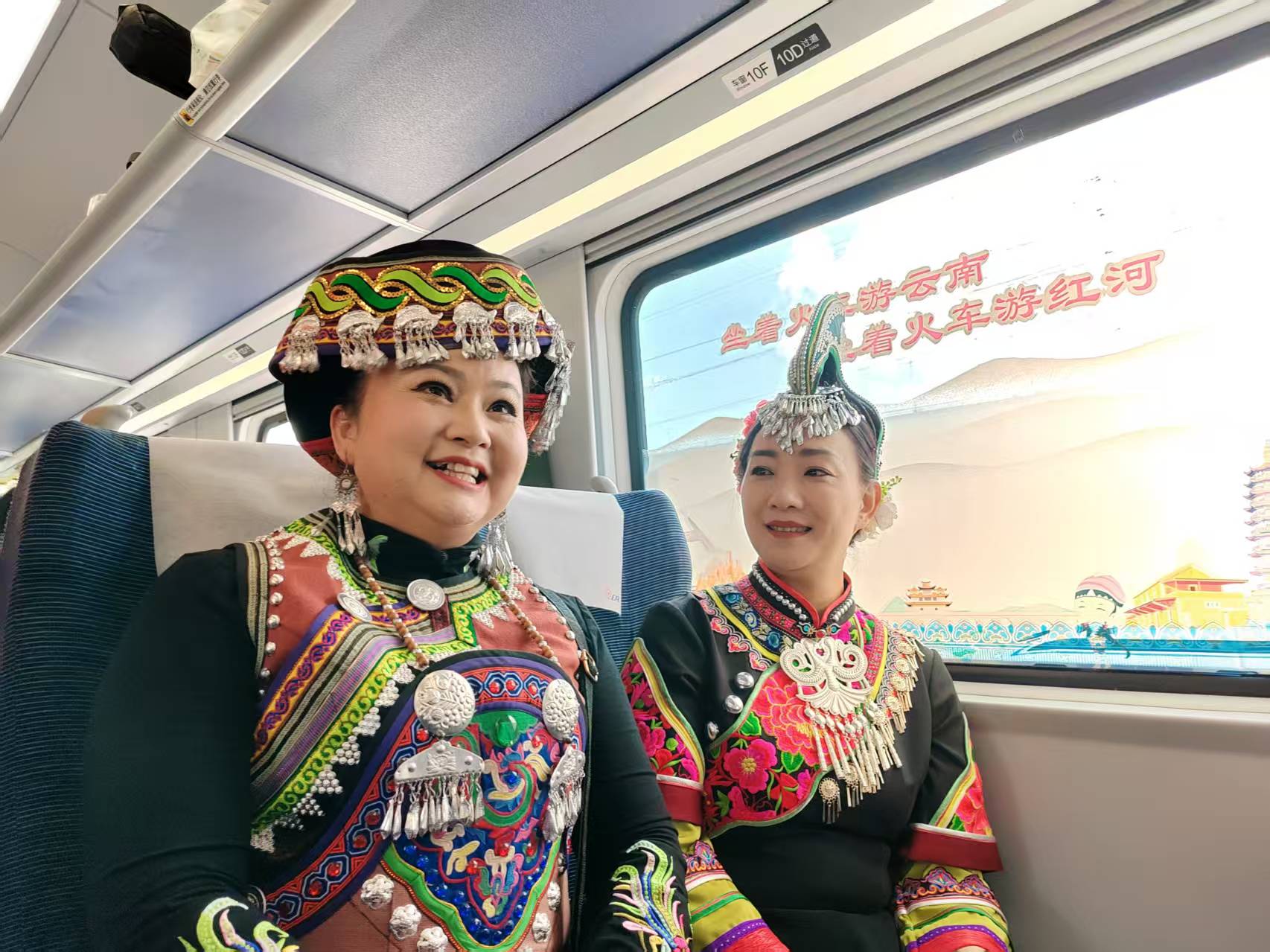 为给州庆之旅增添喜庆氛围,国铁昆明局联合红河州文旅部门在11月15日开行的C4222次列车上举办了特色文化活动。车厢内,建水民歌艺术家们献上了《石榴开花红彤彤》《请到建水来》等具有浓郁地方特色的小调联唱。互动环节中,旅客们踊跃参与学唱建水小调、学说建水方言,获胜者获得了题有书法作品的折扇,车厢化身为感受红河文化的流动课堂,欢声笑语不断。