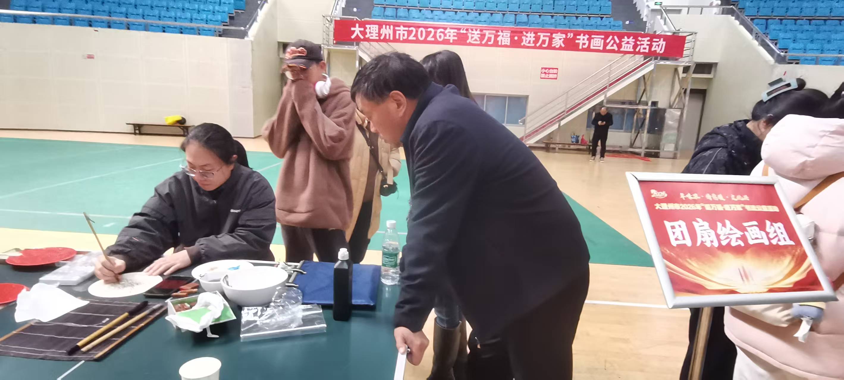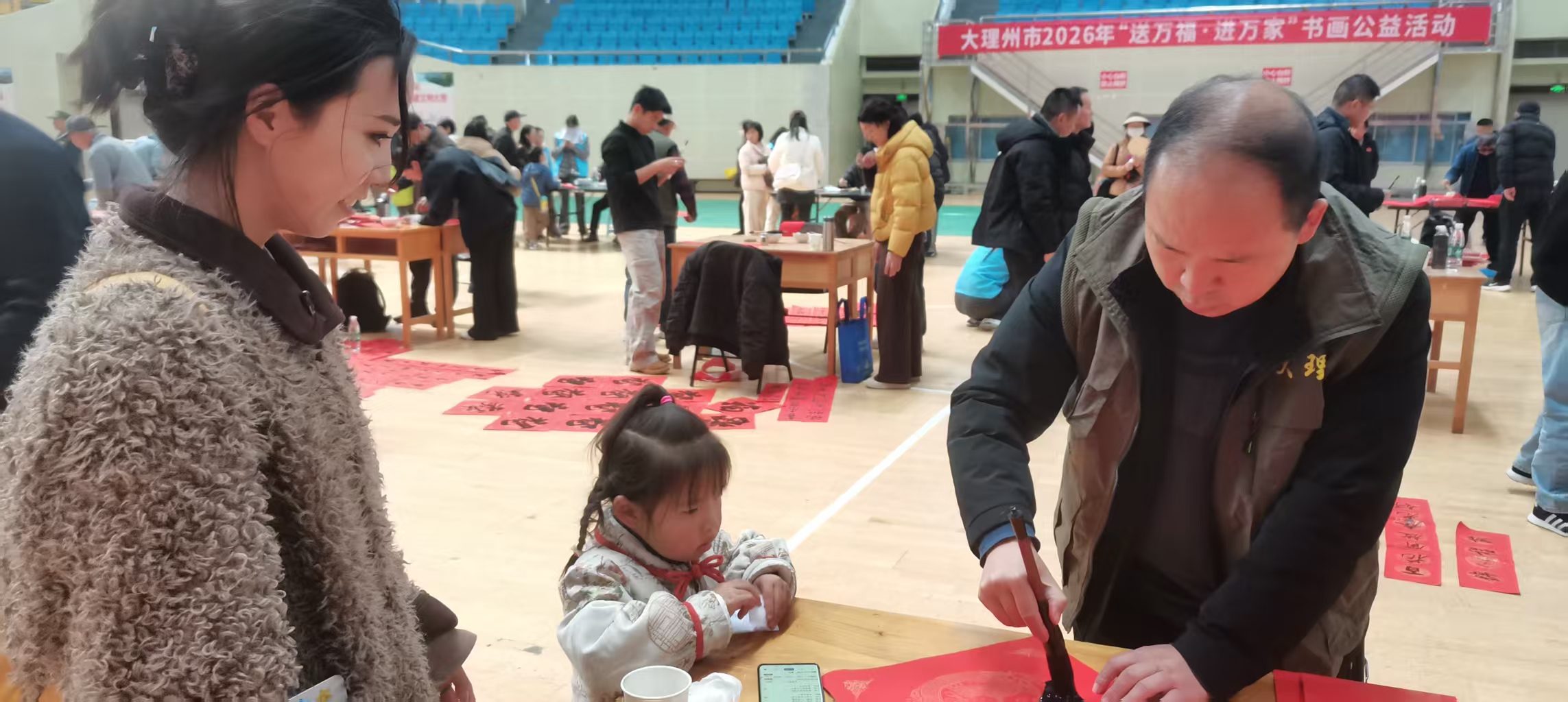 为弘扬中华优秀传统文化,丰富大理民族地区群众精神文化生活,营造欢乐祥和的节日氛围,让广大市民度过一个祥和喜庆、充满文化韵味的 2026 年春节。1月30日下午,由云南省大理州退役军人事务局、大理州总工会、大理州文学艺术界联合会、大理市总工会、大理市文学艺术界联合会联合主办,大理市教育建设投资有限责任公司协办的“年味浓、情意嗳、文化兴”----大理州市2026年“送万福・进万家”书法公益活动在大理全民健身中心室内篮球场圆满落下帷幕。