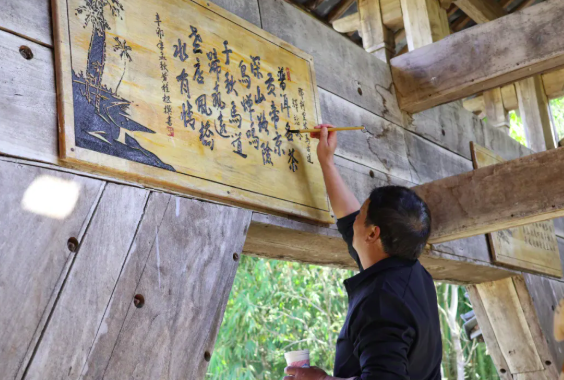 书法老师为木刻楹联、牌匾等进行重新添色 张芸源 摄