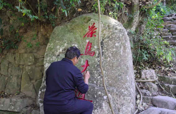 书法老师为石刻文字进行重新添色 张芸源 摄