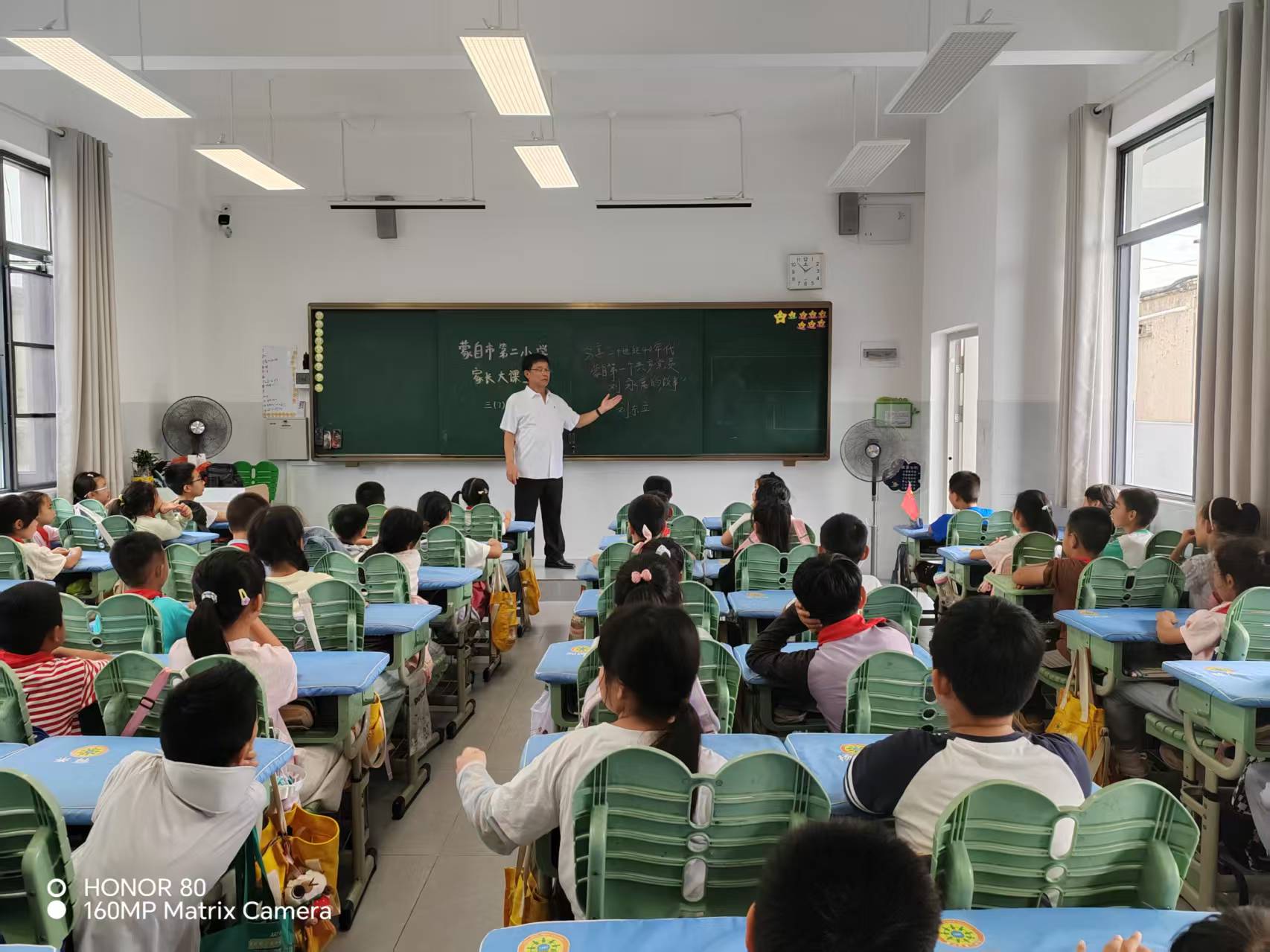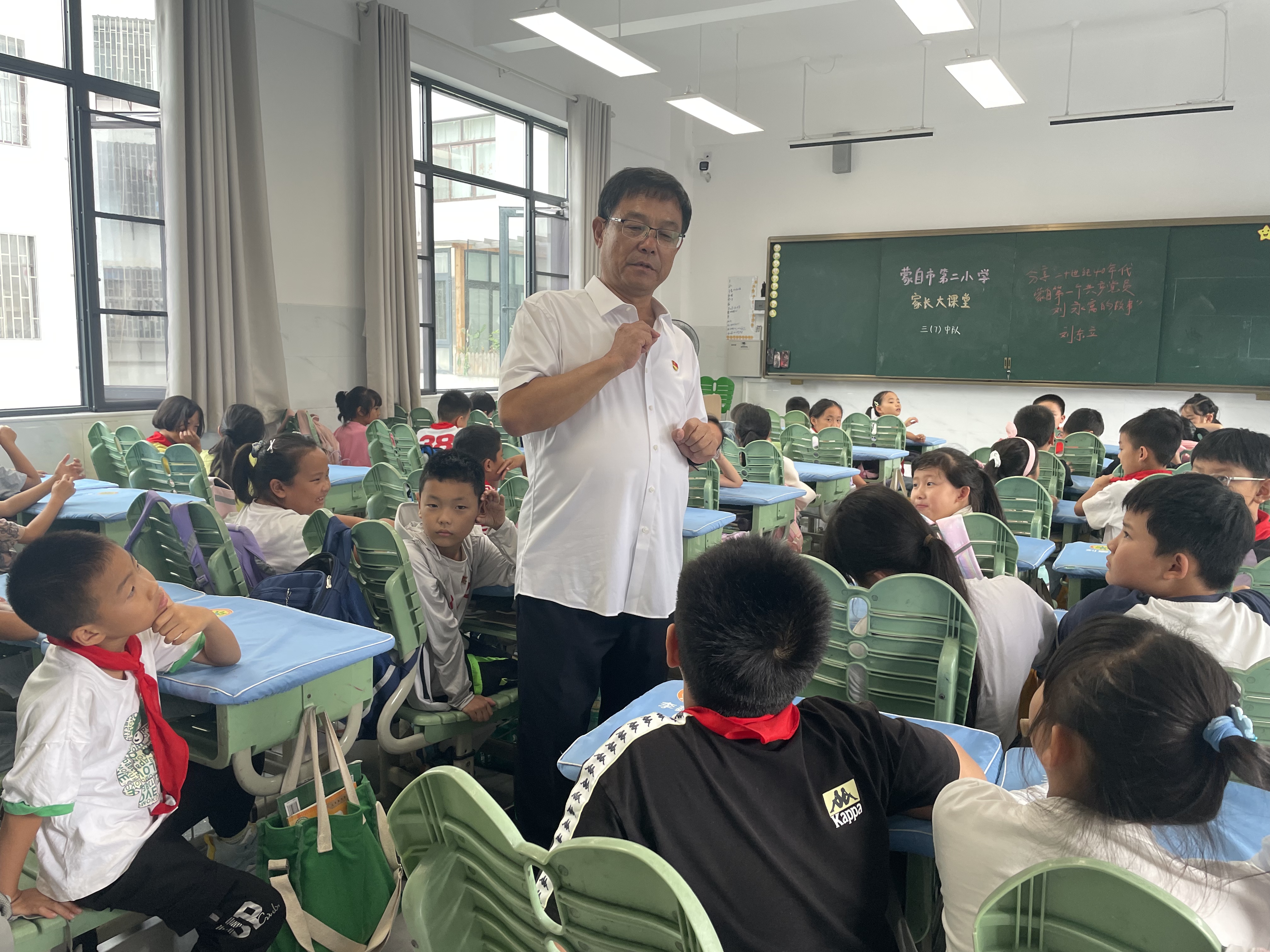 丁梦得同学的外公以分享“二十世纪40年代蒙自第一个共产党员的故事”为主题,为同学们带来一堂生动的爱国主义教育课。外公从纪念中国人民抗日战争暨世界反法西斯战争胜利80周年阅兵为切入点,结合革命先辈刘永富、马慧、李秀云等同志的红色事迹,带领同学们穿越百年历史,从中国共产党成立,讲到领导全国各族人民从“站起来——富起来——强起来”这三个阶段的历史。通过历史对比,外公将“落后就要挨打”的教训深深烙印在孩子们心中,并要求大家铭记历史,热爱党、热爱祖国、热爱人民,好好学习、好好锻炼,成长为祖国的栋梁。
