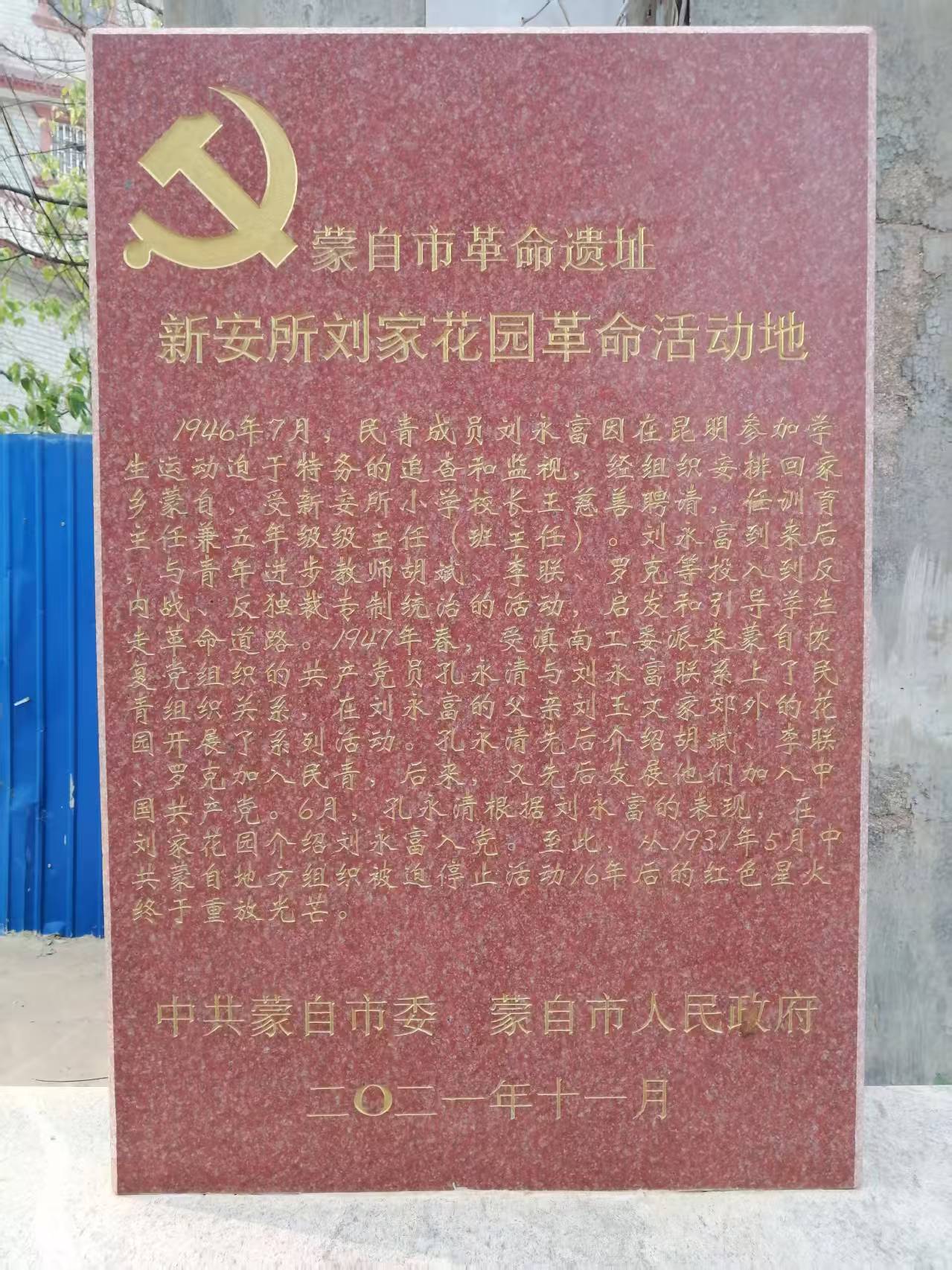 19473月,在刘玉文新安所家郊外的花园开过两次会议,便发展了新安镇小学的教师胡宪章(胡斌)、李金寿(李联)加入民青;19497月中旬,中共蒙自县委扩大会议就在县城刘家楼上召开时,刘家男女老少忙着给与会人员安排食宿及站岗放哨,提供食宿方便。他从不上街买菜,但为了会议,他提起菜蓝子,很快就把菜买回来。在国民党的党、军、警、宪、特机关林立,敌人严密控制下的蒙自城,召开这样大型的高规格地下党会议,刘玉文毫无畏无惧,甘冒杀头灭门之险,保卫了会议的安全,他实为共产党最可靠的朋友。
