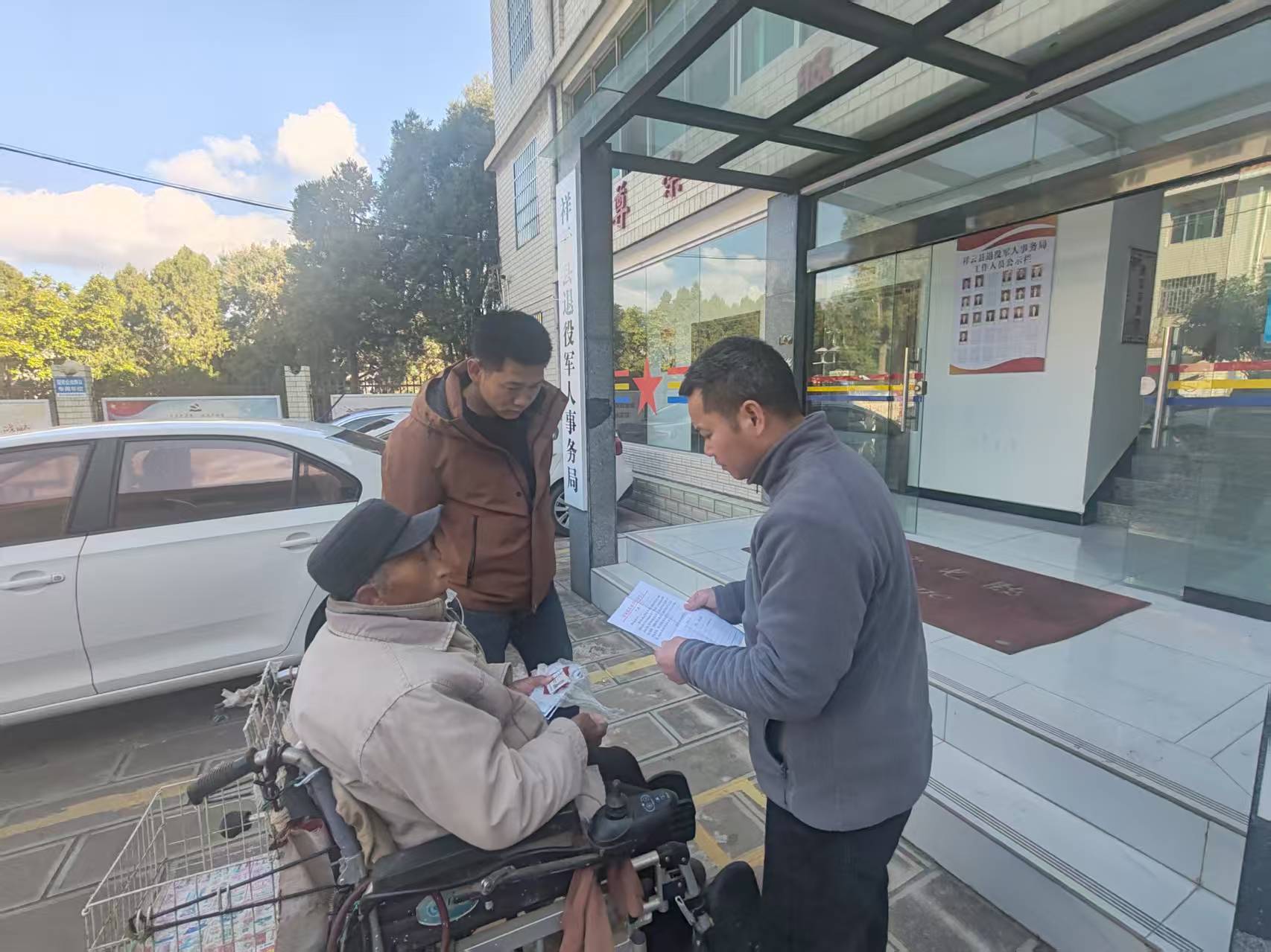 祥云县祥城镇芮家营村一名年近九旬的退役军人驾驶电动轮椅来办理相关申请业务,外出办事回到单位的职工杨严见状,忙迎了上去,问明情况后,考虑到身有残疾的老兵上楼不便,迅速叫来优抚股股长李小军,两人在院内现场为这名老兵排忧解难。