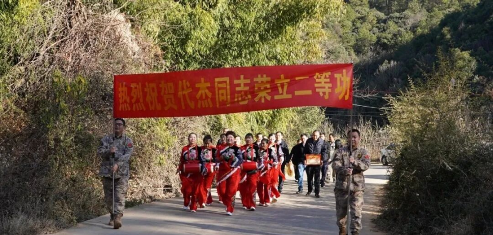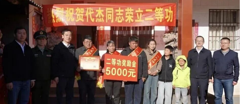 在慰问活动中,张建荣一行为代杰的父母披上绶带,将喜报和奖励金送到他们手中。代杰的父亲激动地表示,孩子能在部队立功,我们感到无比骄傲和自豪;感谢部队的培养,也感谢县委、政府对我们军属的关心和照顾,我们会继续鼓励孩子在部队好好干,为国家再立新功。