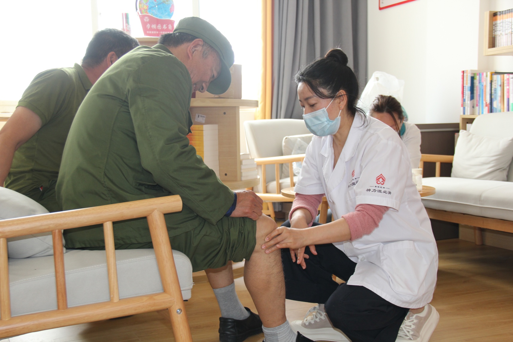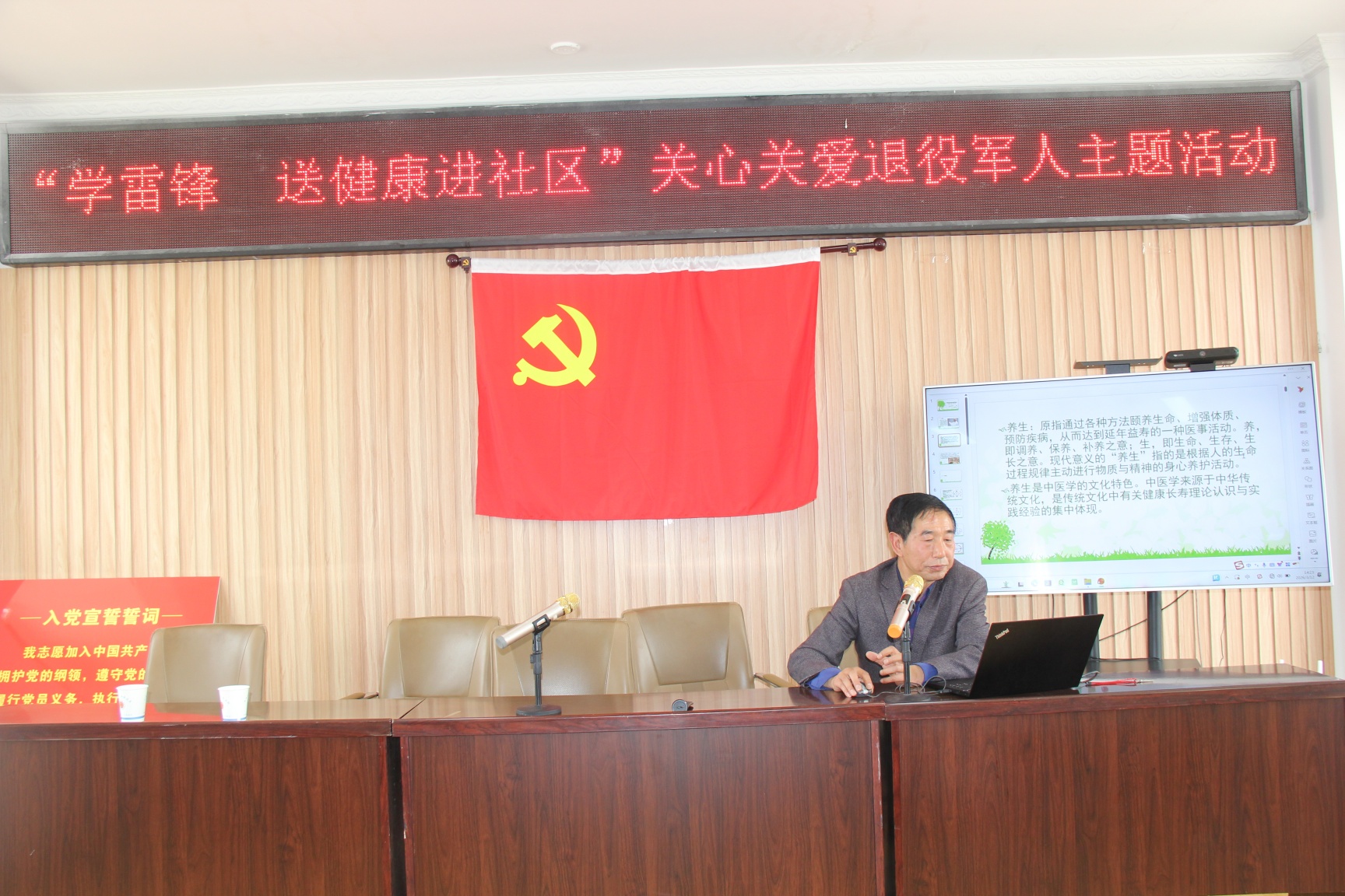 社区活动现场气氛热烈且温馨,闻讯而来的老兵聚集在会议室,聆听健康知识讲座,进行健康体检和感受推拿等治疗。