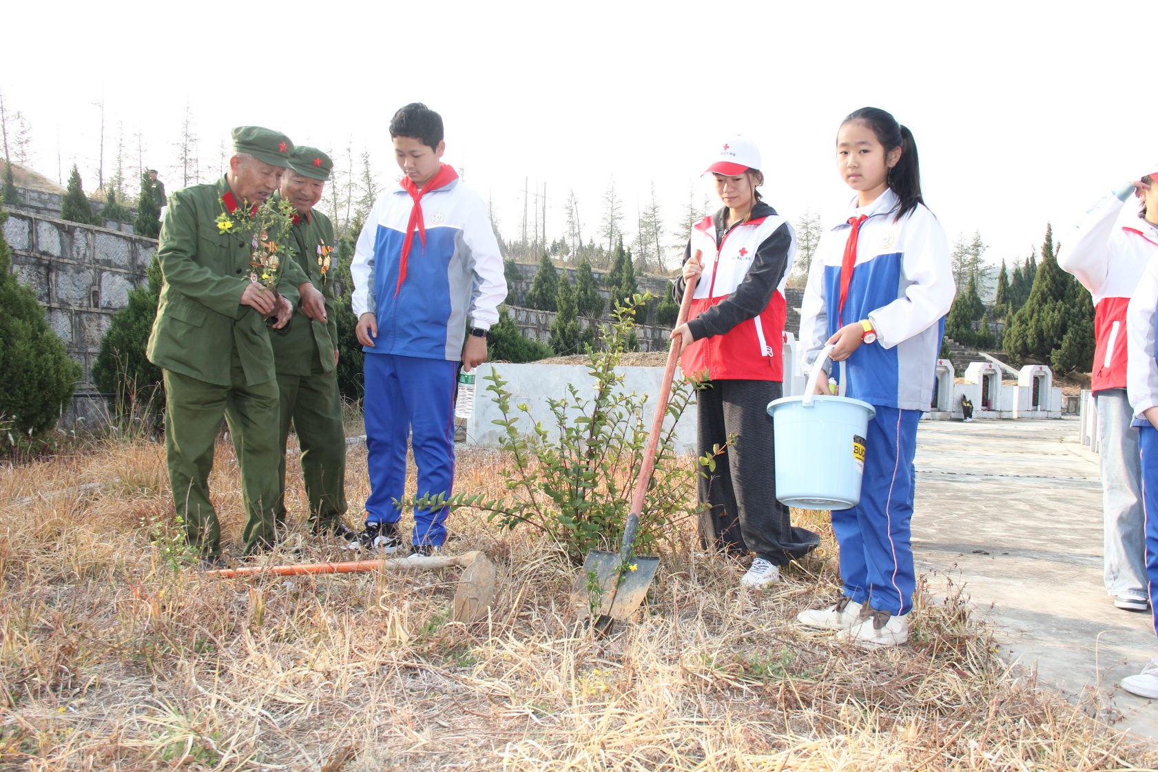 祥云太安医院红十字会的八旬志愿者丁自明,与少先队员一齐在烈士陵园栽下迎春花,并一同浇水。