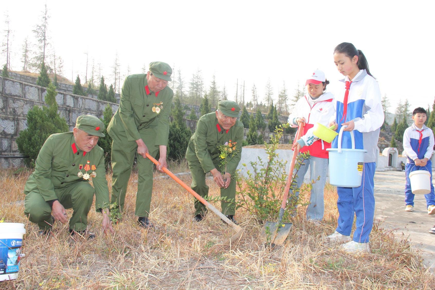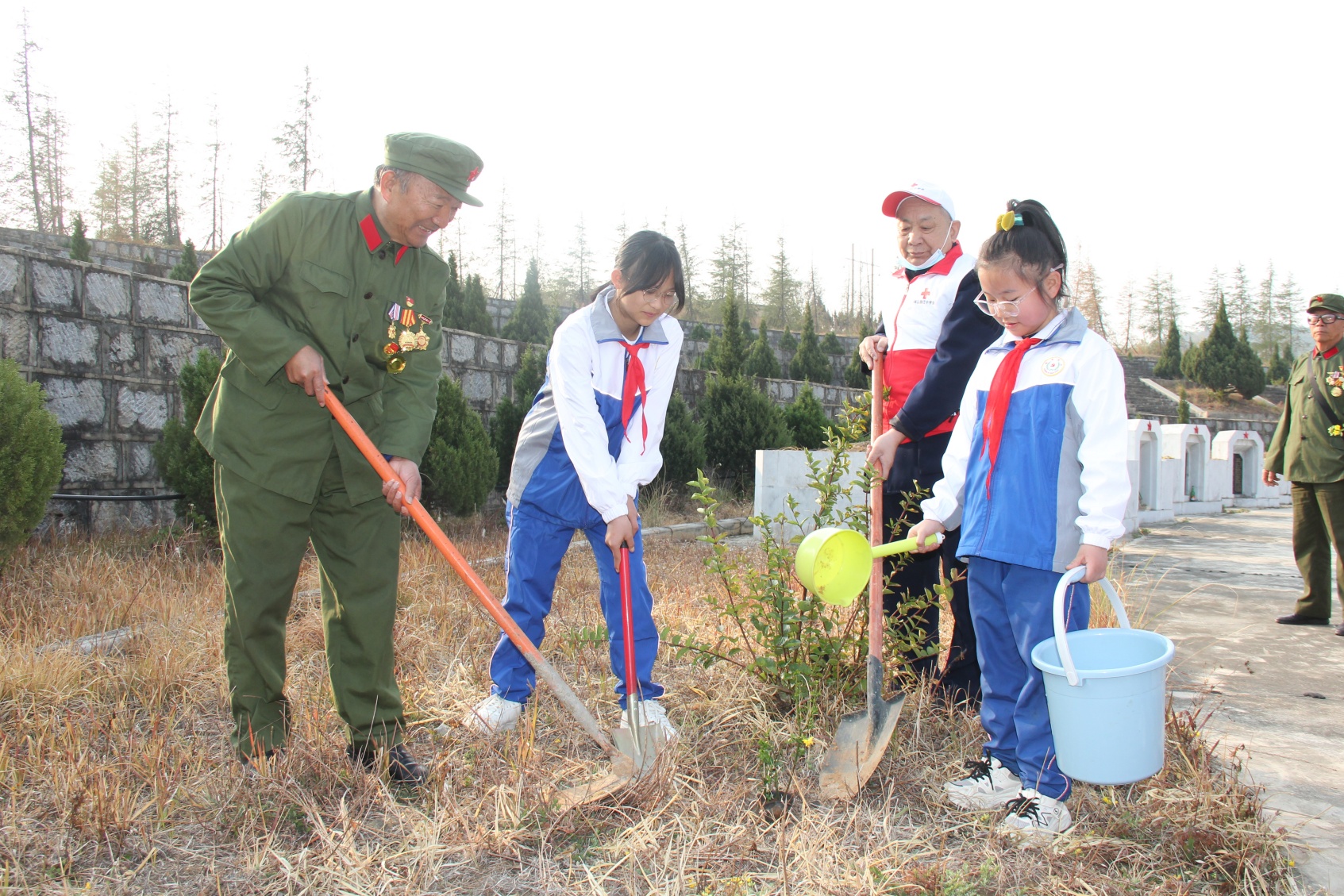 在明媚的朝阳照耀下,少先队员与退役军人志愿者的红十字会高龄志愿者“小手拉大手”,“一老一小”在烈士陵园植下“爱心树”,缅怀革命先烈,既表达了对英雄的敬仰也履行了共建绿色家园的承诺。