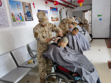 部队官兵化身暖心 “理发师”,一边为老人们娴熟修剪头发,一边陪他们亲切拉家常。