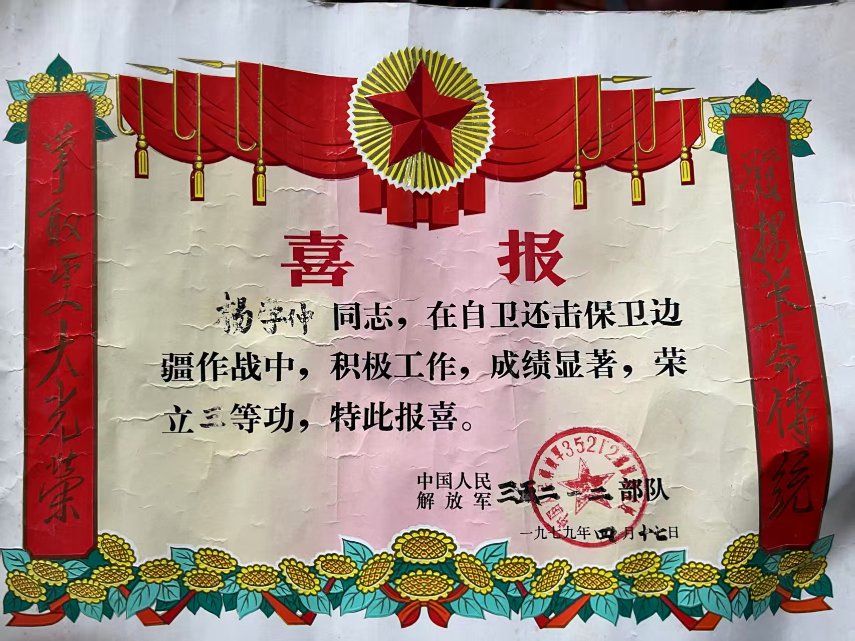 战场上,他英勇顽强,吃苦耐劳,与战友们冒着生命危险,在阵地上抢救伤员,抢运烈士遗体遗物,较好地完成了上级交给的处理烈士工作及各项战斗任务因参战战绩显著19794被中国人民解放军35212部队政治处授予三等功。