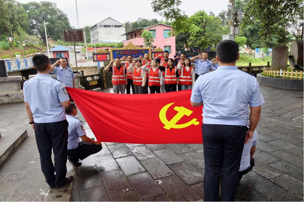 随后,全体党员干部在畹町桥头整齐列队,面对鲜艳的党旗高举右拳,重温入党誓词。铮铮誓言回荡在口岸上空,提醒全体党员不忘初心、牢记使命,进一步坚定为党的事业奋斗终身的决心。