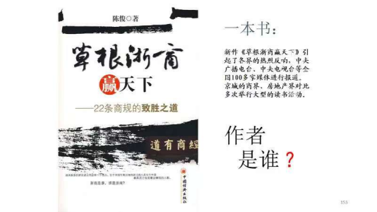 由中国版社版的草根浙商赢天下》一书依据民间一直流传着浙商的22条商规为主要线索,从政治时局、商业理念、为人处事、从大局着眼、从小事着手,作者以亲身经历、亲眼所见、亲耳所闻的视角,以细腻的写作方法,用原创平实的语言勾画出了草根浙商在商界如何创业、如何防忽悠、如何抱团、如何投资、如何开发项目、如何成功、如何处置风险、如何化危机为商机的种种实战范本和感悟,全方位揭密了草根浙商在掌声和鲜花的背后是串串艰辛的脚印和悲喜交加的泪水。