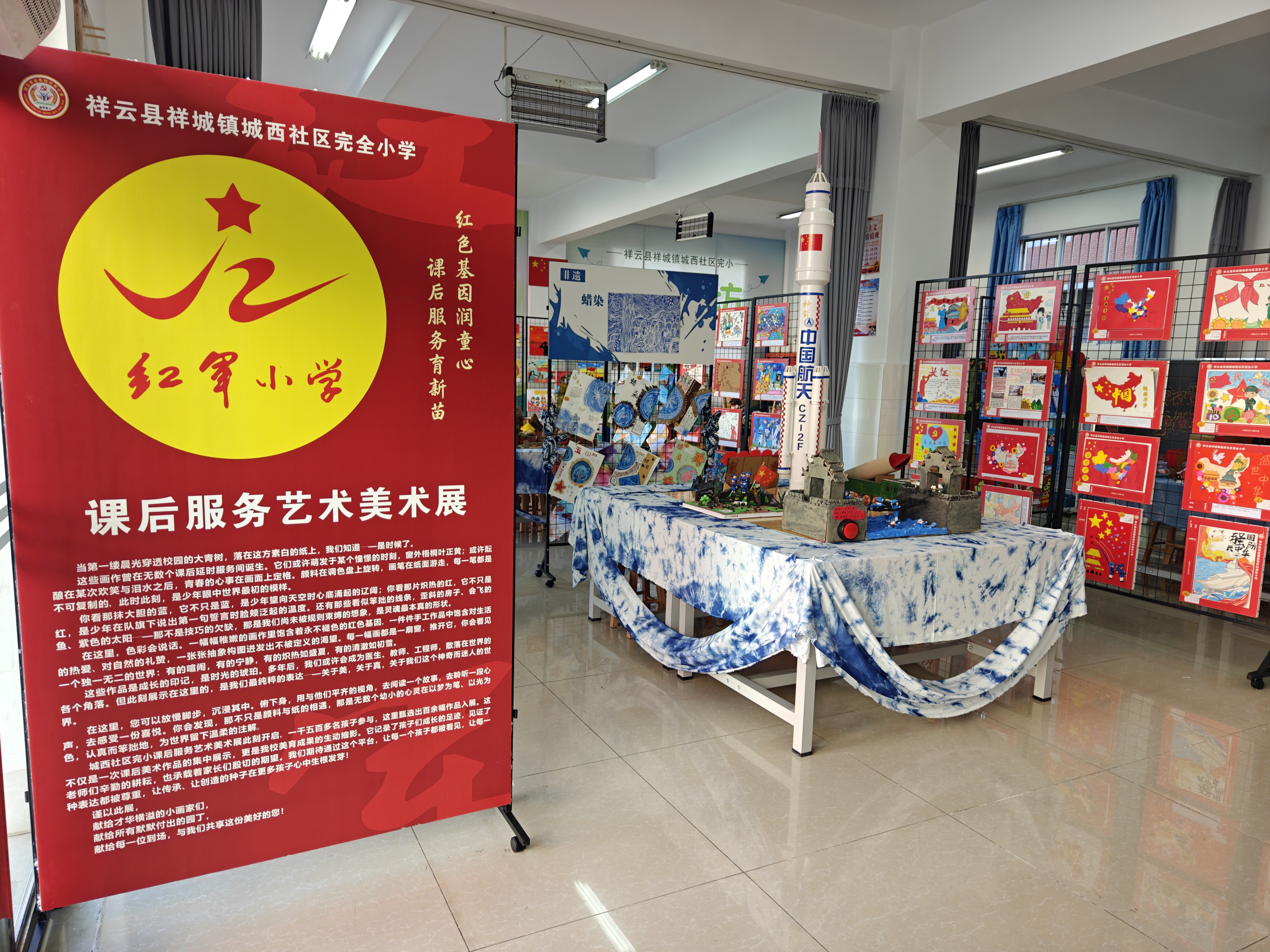 为厚植青少年红色情怀,弘扬优秀传统文化,全面展示“双减”背景下课后服务育人成果,2025年12月18日,云南省祥云县祥城镇城西社区完小以“五育并举、童心绘梦”课后服务成果艺术美术展在学校新创坊隆重开展,精彩纷呈的美术作品,充分彰显了“双减”政策实施以来城西社区完小有效开展课后服务取得的可喜成效。