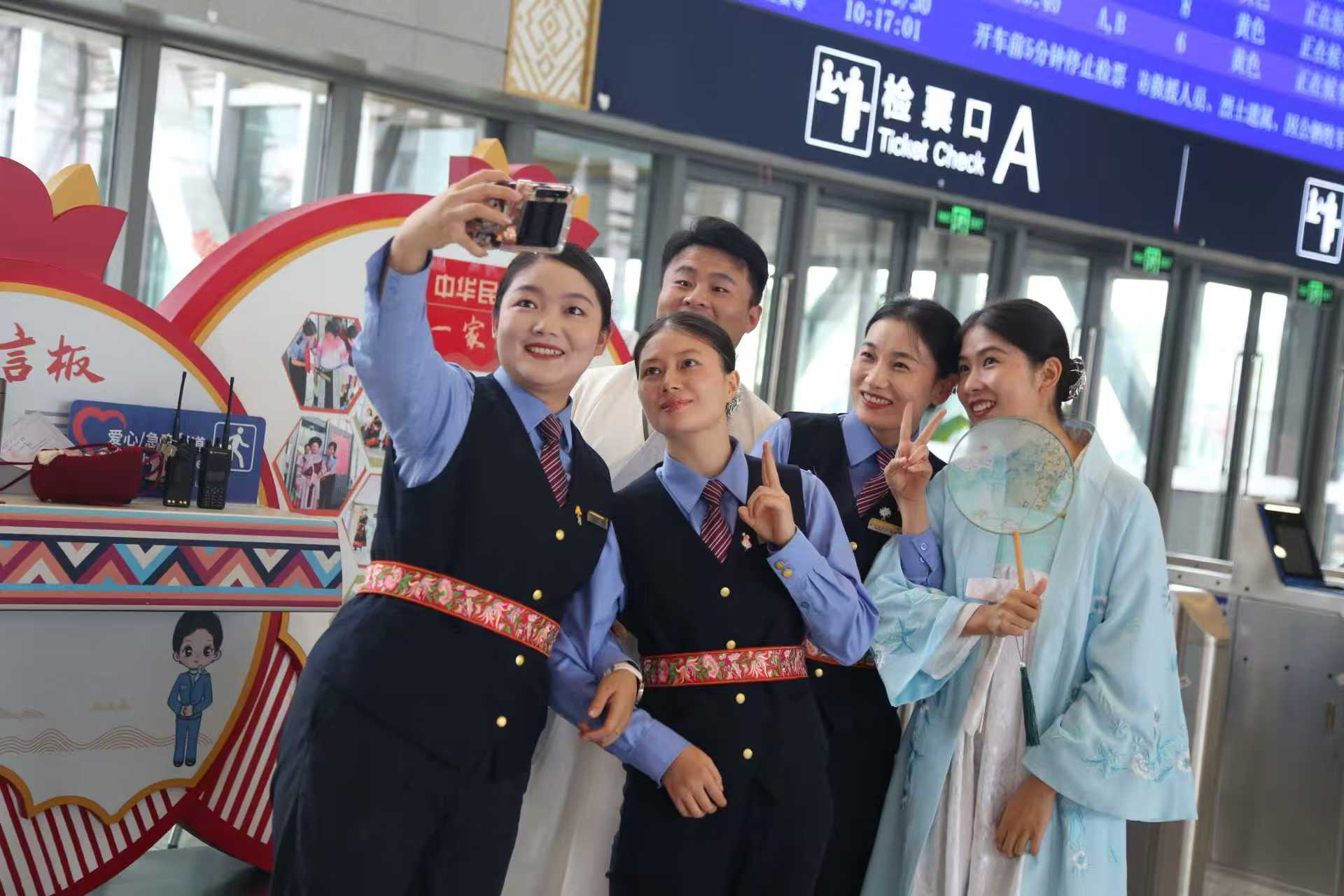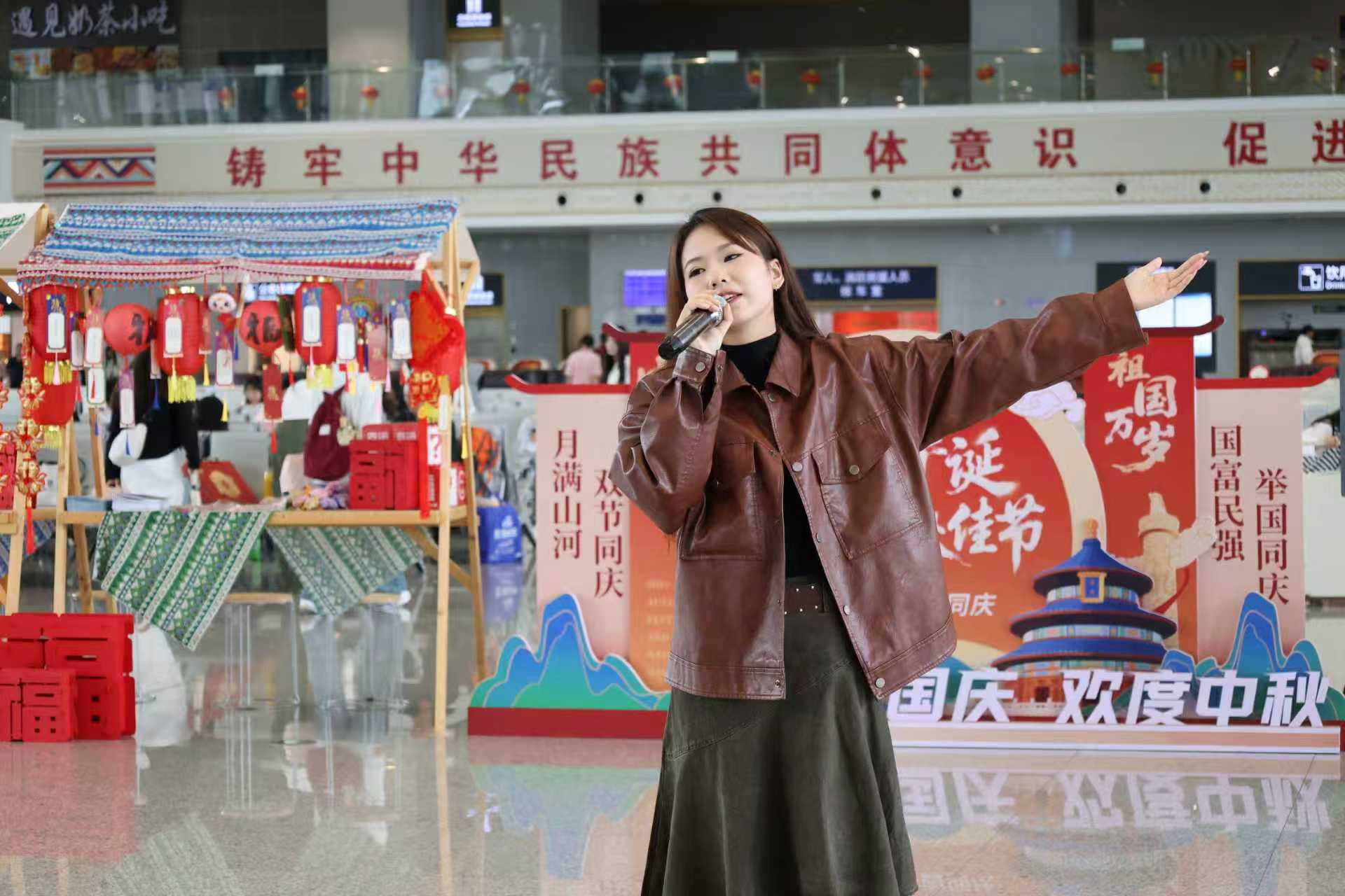 车站工作人员和当地文旅部门志愿者“路地联动”,为旅客带来了一场极富民族风情和家国情怀的视听盛宴。
