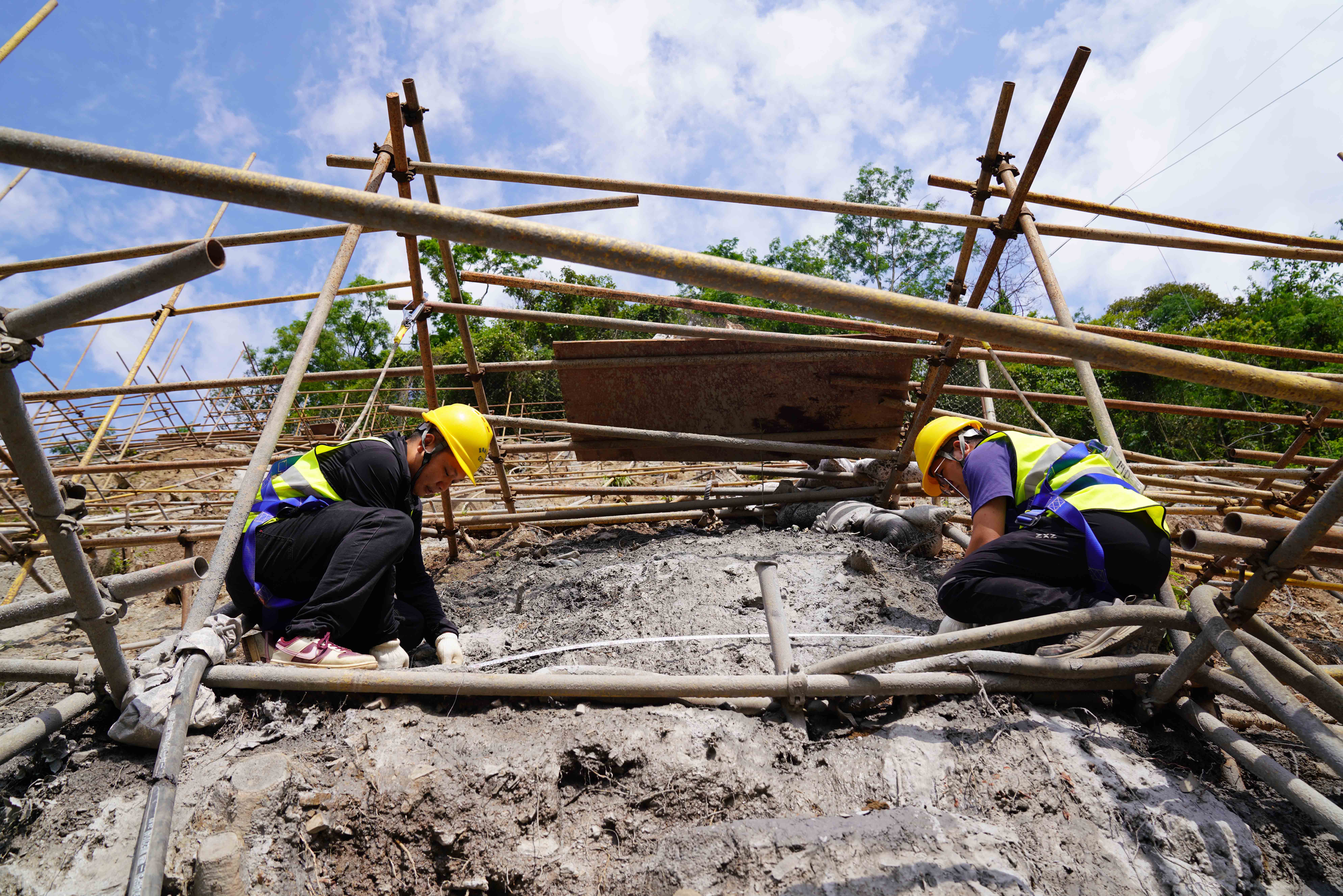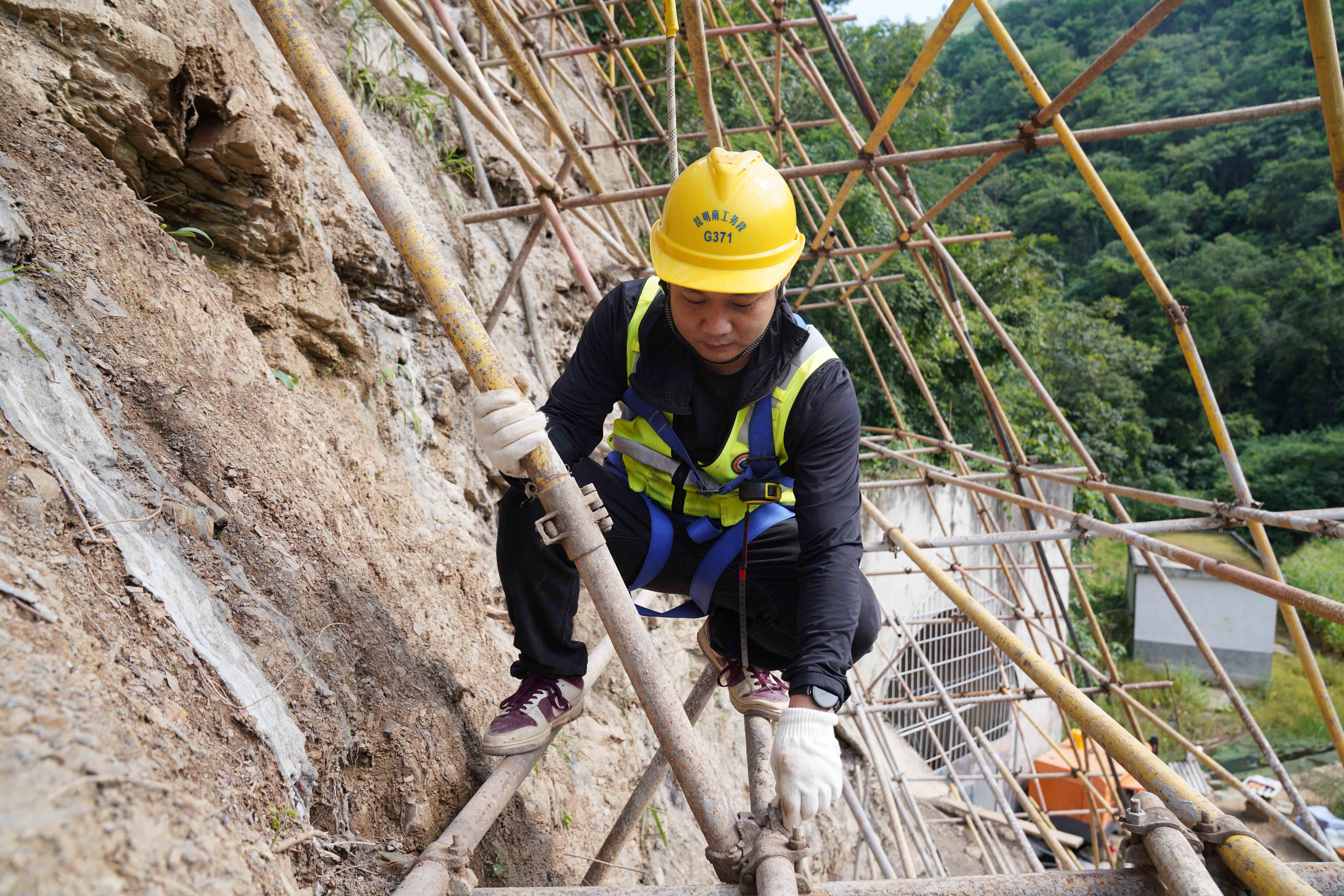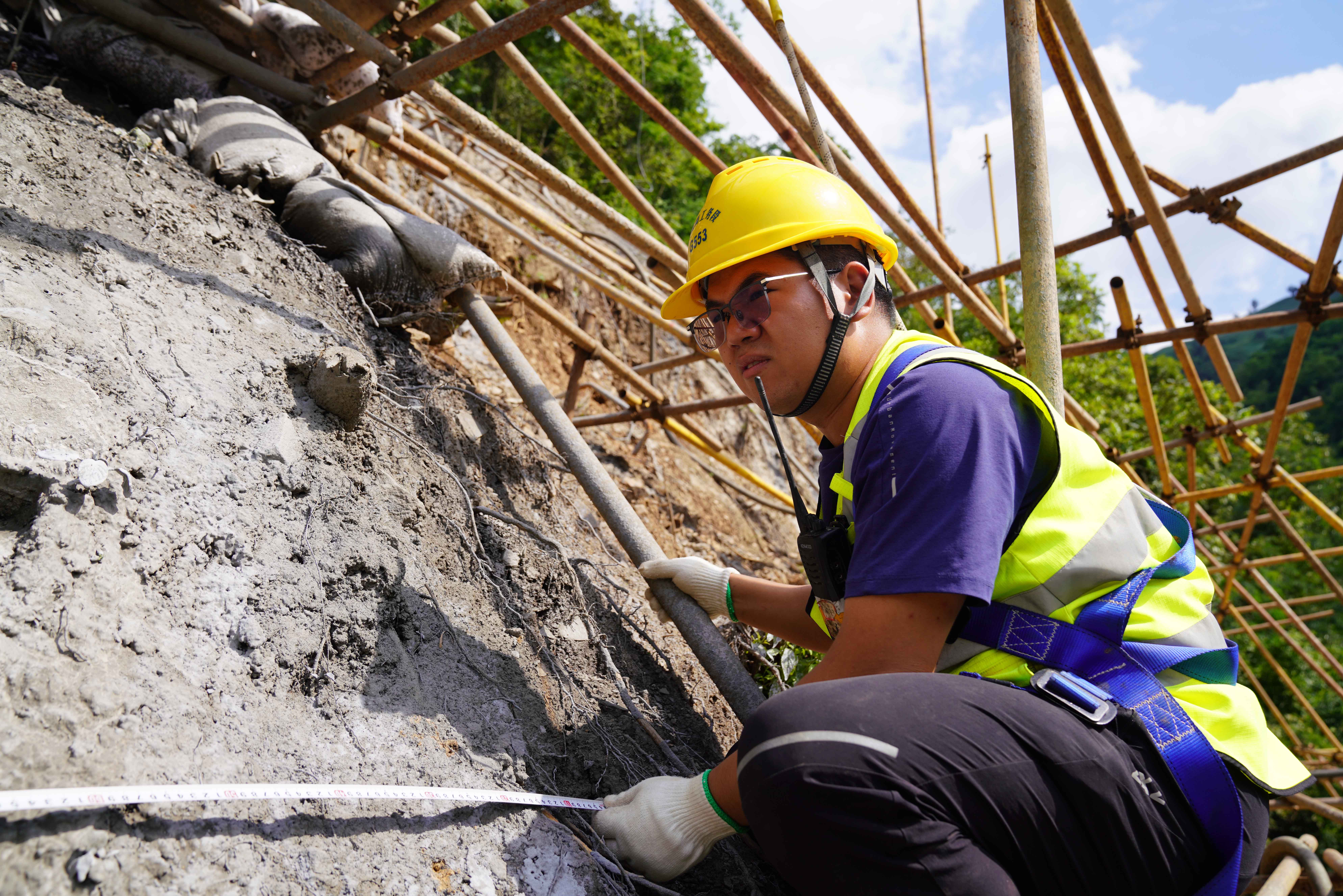攀爬、清理危岩、钻孔、安装锚杆…每一个动作,都需在陡峭的斜坡上完成,身体的平衡、工具的握持、同伴的协作,都必须在高度集中精神下进行。张先斌在下方担任防护员,眼生紧盯着上方两人的一举一动,手则牢牢攥住对讲机。