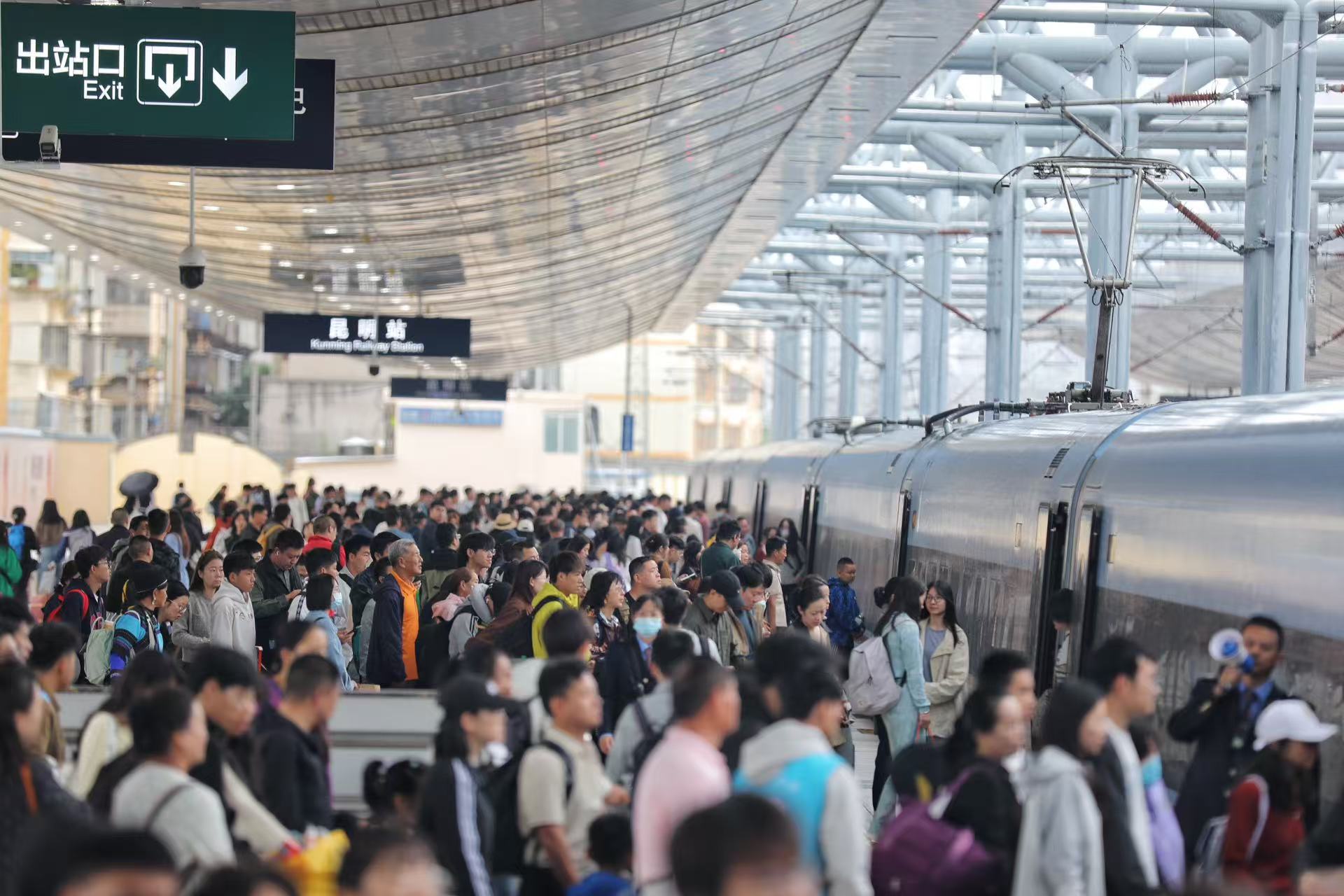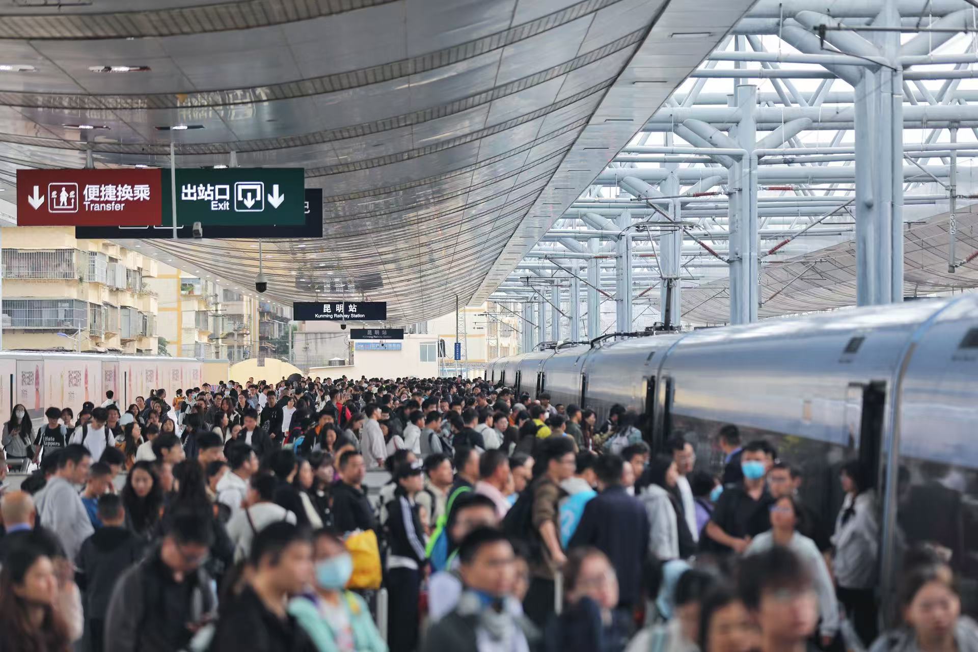 在提升运力的同时,国铁昆明局各大车站加强了站车组织工作,增派工作人员在进站口、天桥、地道、电梯、站台等关键位置进行引导和服务,以确保旅客出行顺畅。
