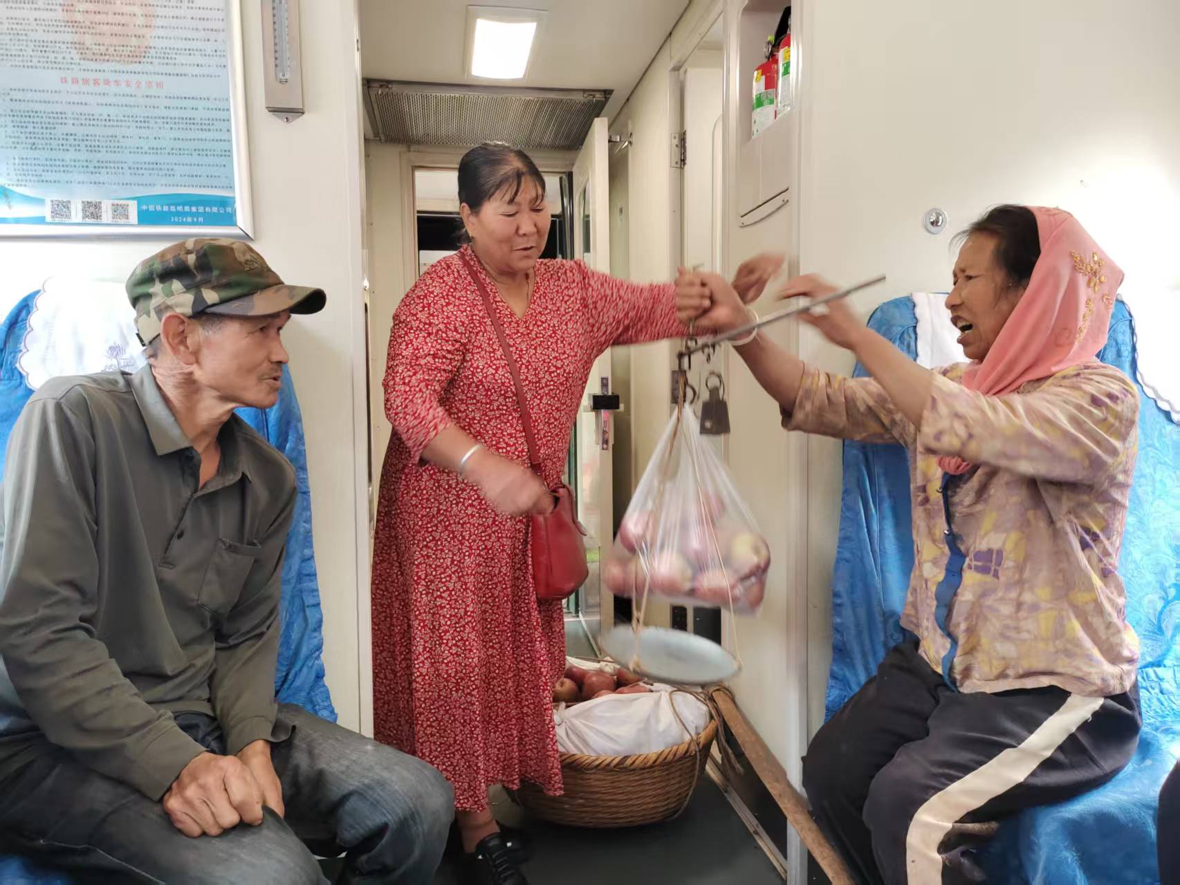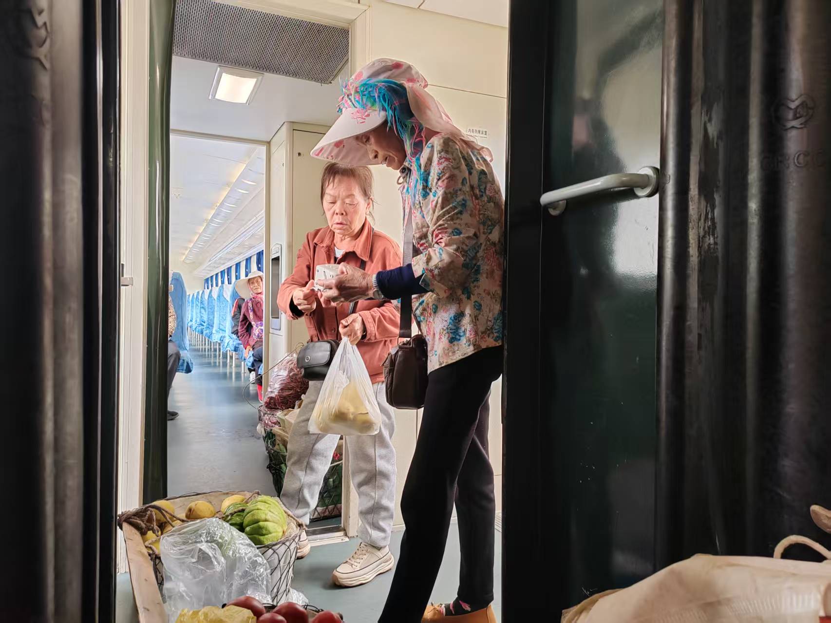 乘客陈女士介绍,每次只要乘坐这趟火车,她都会买点水果和蔬菜回家,很方便。