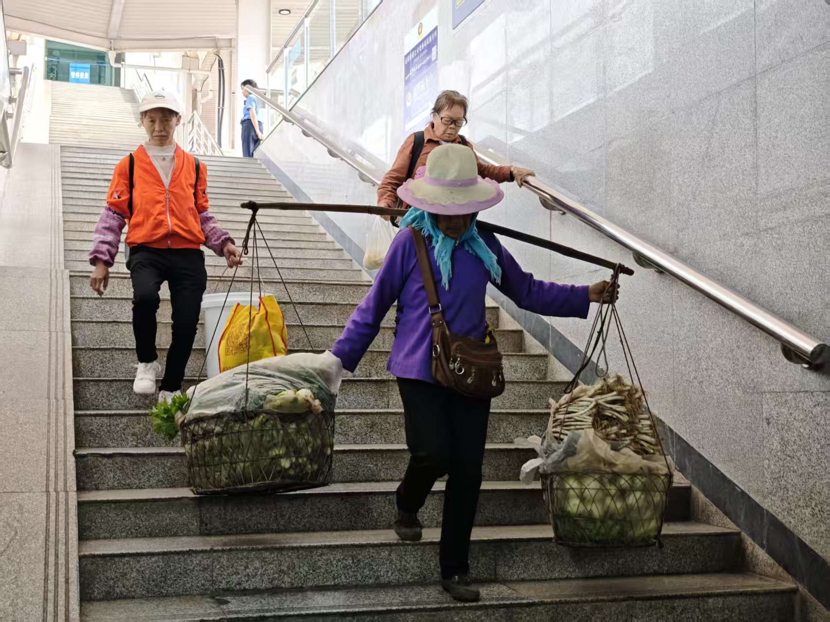 果不其然,9时22分,列车在吴官田车站停妥后,十多个菜农挑着扁担、背着箩筐早已在站台上等候。在车站和列车工作人员的有序组织下,不到3分钟,所有箩筐和扁担全部有序摆放到位,一时间,车厢里变得热闹起来。在列车过道里,番茄、扁豆、茄子、辣椒、白菜、蒜苗等时令蔬菜琳琅满目,还有苹果、梨等水果和云南夏秋季节特色山珍野生菌。列车再次启动,此起彼伏的吆喝声、讲价声、微信支付提示音已悄然响起,给车厢增添了一股“菜市场”的气息。